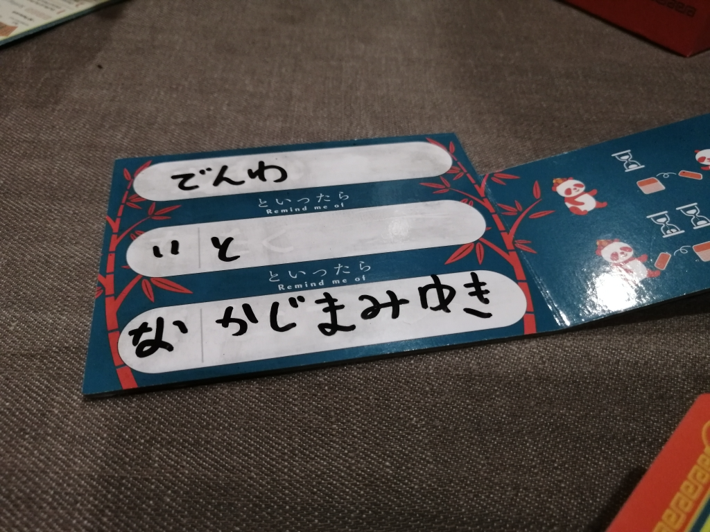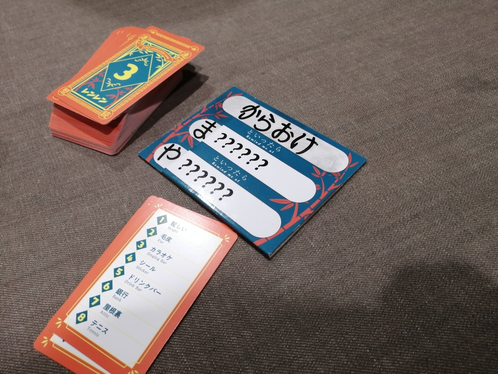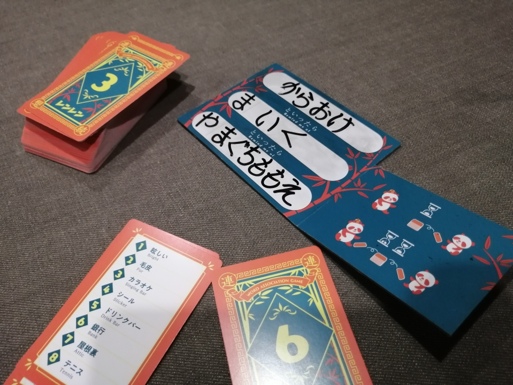 あらかじめ一番はじめのテーマは分かっていて、親プレイヤーは2番目と3番目の1文字だけ分かるようにする。制限時間2分で当ててもらえたらいいが、はじめの1分で当てられると親プレイヤーは得点にならず、残り2分で当てられると親プレイヤーと当てたプレイヤーは得点獲得となるので、連想させる1文字がうまく誘導できるバランスにする手腕が親プレイヤーに求められる。