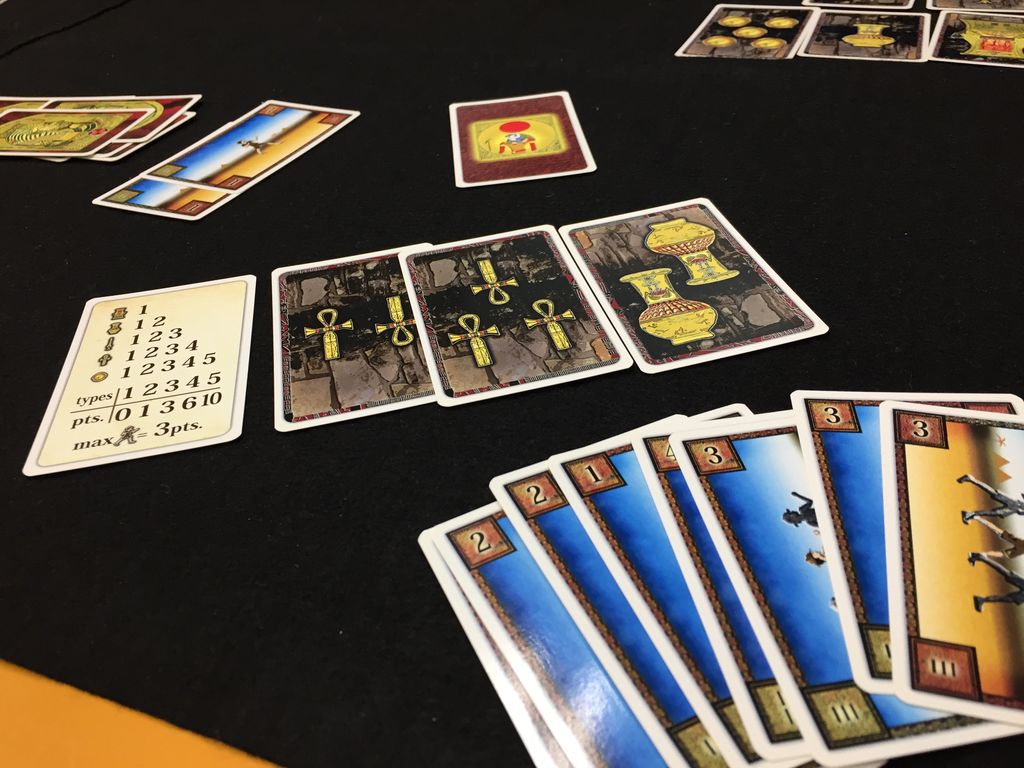 これ以外に手札にファラオカードが2枚あり、これでカードの補充が可能になります。補充は使われたカードが(他のプレイヤーも含めて)すべて手元に来ます。そのため、補充のタイミングも重要です。(これは競りと同時にするので、競り落としにかかっている人は補充できません)