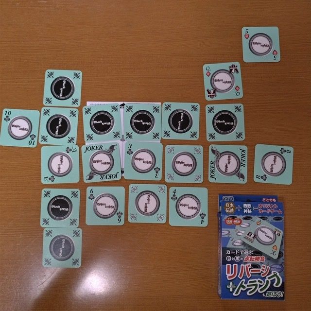 一方、リバーシで遊ぶ場合は、全てのカードを使います。ルールは普通のリバーシと同じなので特に問題はないと思いますが、盤が無いのでどこまで置けるのかが、わかりにくいです(中央から数えて4枚目が端です)。特に、四隅に置く場合は注意が必要かとお思います。なので、あと何枚で端なのかを考えながらプレイした方が良いでしょう。