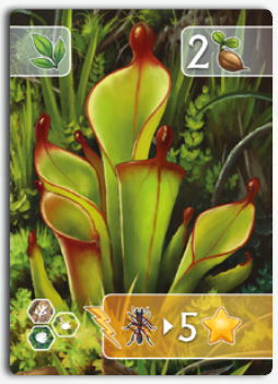 ①他のカードとは異なり、すべての植物は同じタイプです。 ②植物カードは、必要な数の種子(🌱)を消費することによってのみ引き付けることができます。 ③すべての植物カードの効果は15/16ページに解説されています。 ④植物カードを引きつけるには、動物と異なり、バイオームタイルのへクスや獲物を必要としません*。彼らは単に居住できるバイオームに配置することができます(p.10)。 ⑤*唯一の例外は食虫植物で、捕食カードのように機能します(p.15)。 |