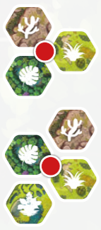 プレイヤーが収穫カードをプレイした場合、すべてのプレイヤーカードを手札に戻します。 さらに、プレイヤーはプレイヤーボードに配置されたバイオームタイルに応じて種子(🌱) (熱帯雨林タイルごとに3つ、草原/湿地タイルごとに0.5、低木地ごとに0.5、端数繰り上げ)と1つの水(💧)を受け取ります。 |