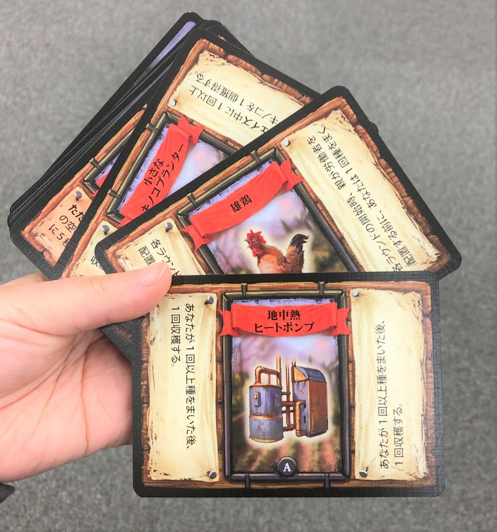 アクションには、トマトの種を得る、農地を得る、種を植える、などシンプルなものや、サービスカードを得るなどがあります。サービスカードは、ゲームで5枚固定で提示され、特殊な効果をもたらすものです。