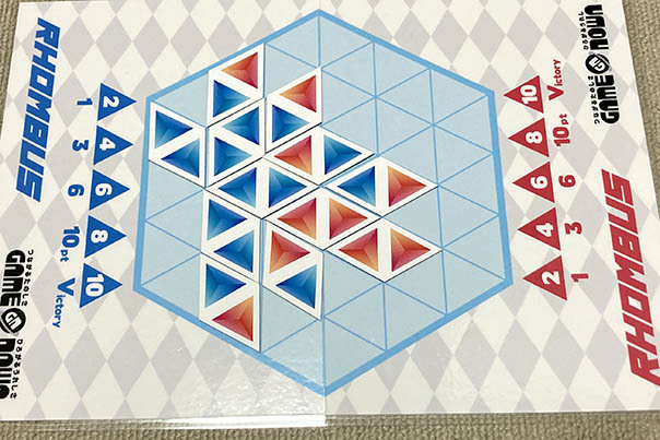 2人用のゲームで、1色もしくは2色に塗り分けられたひし形のタイルを、交互に置いていく。