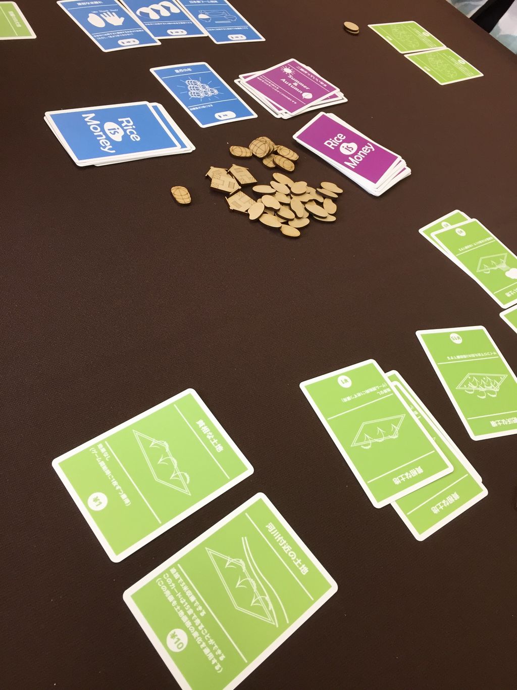 田んぼによって特殊効果があったり、アクションカードから効果が合ったりして、増えたり減ったりします。最後にイベントカードから影響があり、それらの結果から収穫があります。