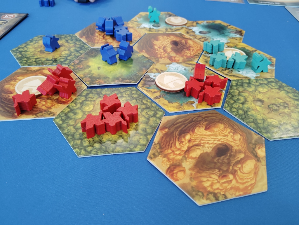争ってないプレイヤーはただただラッキーなのですが、1個でもコマがタイル上にいると支配している扱いになるので村を建設しやすく、資源が生まれて伸び伸びされるから、戦わねばならぬ時があるのです。
