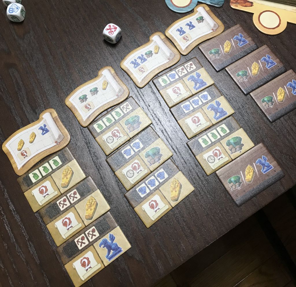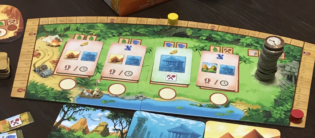 まず序盤にピラミッドと冒険マスで何かを得ると、ついでに+1点もしくは時計がもらえるタイルを取得し、装備。