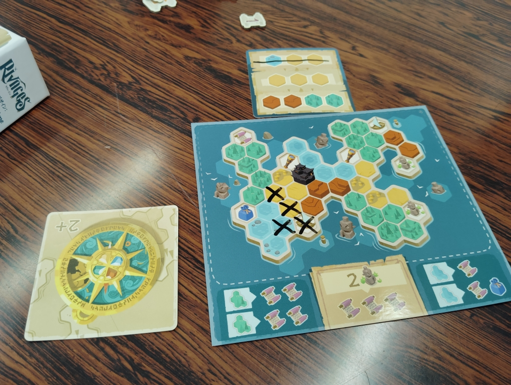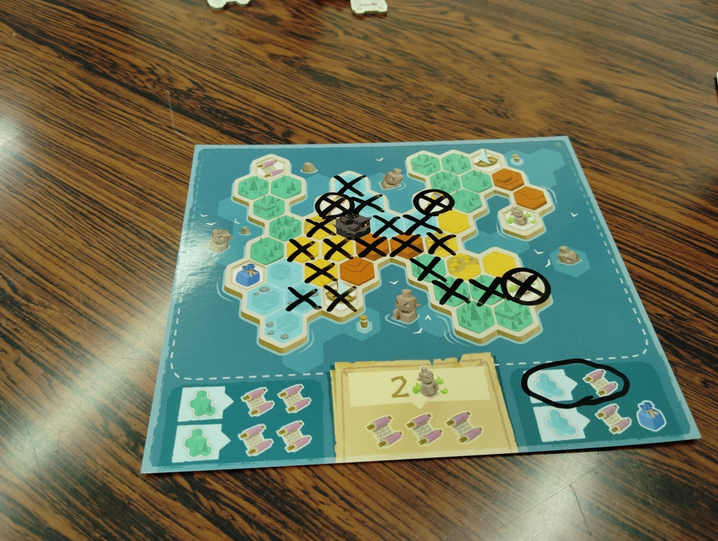 同時進行のゲームで、探険カードの一番上にあるタイルマークをチェックして、自分の島の地図の船から繋がるようにチェックしていく。