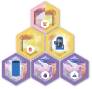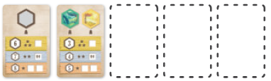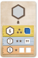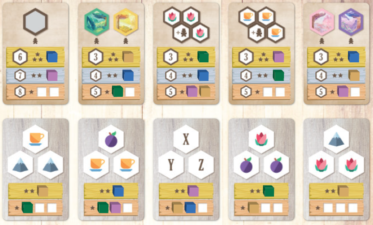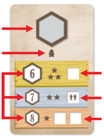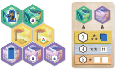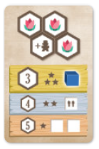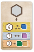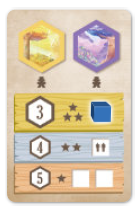 共通の地形目標カードが達成されると、最初に達成したプレイヤーは、カードの金セクションにキューブを置きます(2人プレイの場合は銀)。残りのプレイヤーは、より高い必要数で同じ地形目標を達成することができ、2番目のプレイヤーは銀セクションに配置され、残りのプレイヤーは木セクションに配置されます。 |