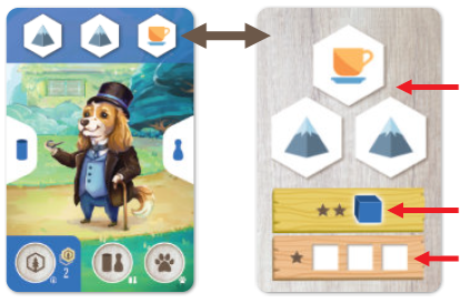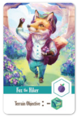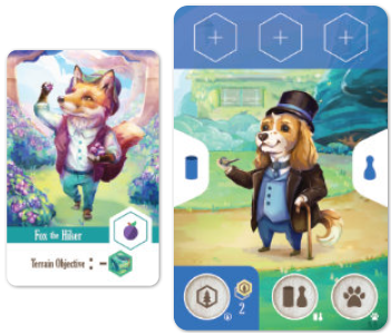 この例では、キツネは青プレイヤーのコンパニオンであり、緑の地形の必要数を1つ減らすのに役立ちます。 |