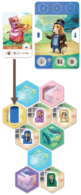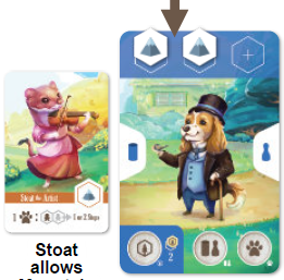 オコジョは山トークンを収集可能にします。 キツネはベリートークンを収集可能にします。 左に示した例を使用すると、青プレイヤーのすべてのコマ(メイン、円柱、ポーン)は山とベリーのトークンを集めることができます。 |