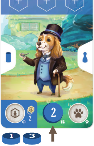 この例では、青プレイヤーは「2」の番号のアクションディスクを配置して、移動アクションを選択しました。 ハリネズミは彼のコンパニオンであるため、青は1アクションポイントを消費して2つの「お茶」トークンを、 |