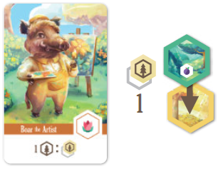 イノシシ 地形アクション中、選択した地形タイルを中央エリアの空き地形に配置するのに必要なコストが1アクションポイントだけになります。 |
