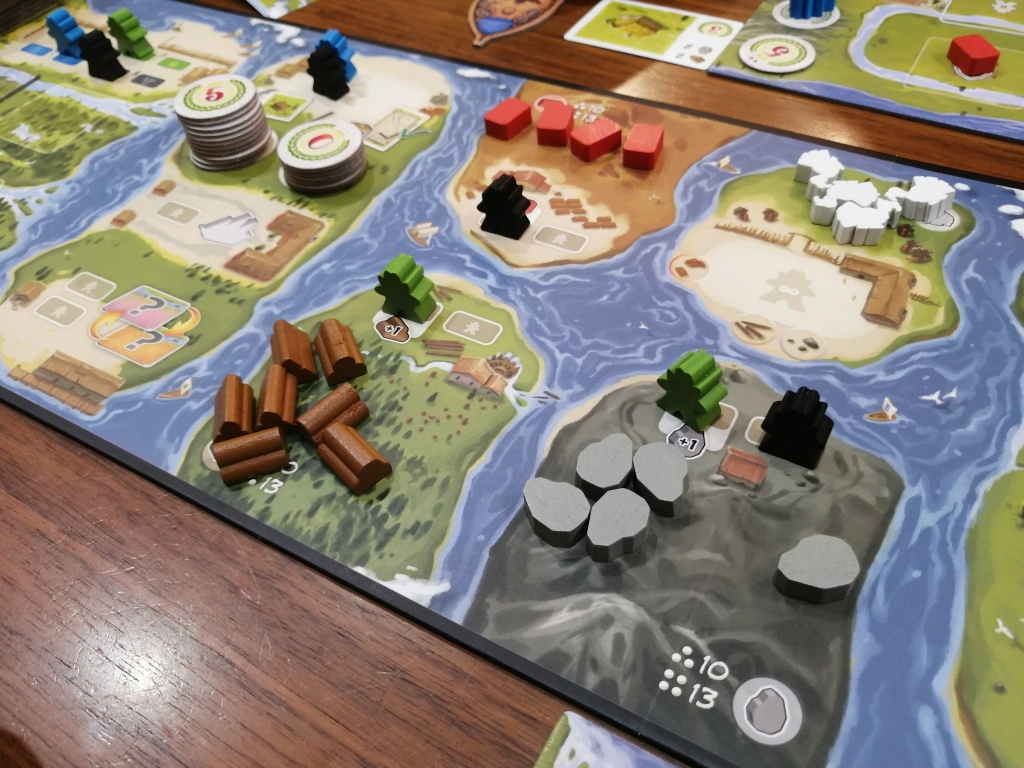 個人ボードにタイルを配置したり、資材を集めてカードを購入したりするワーカープレイスメント。