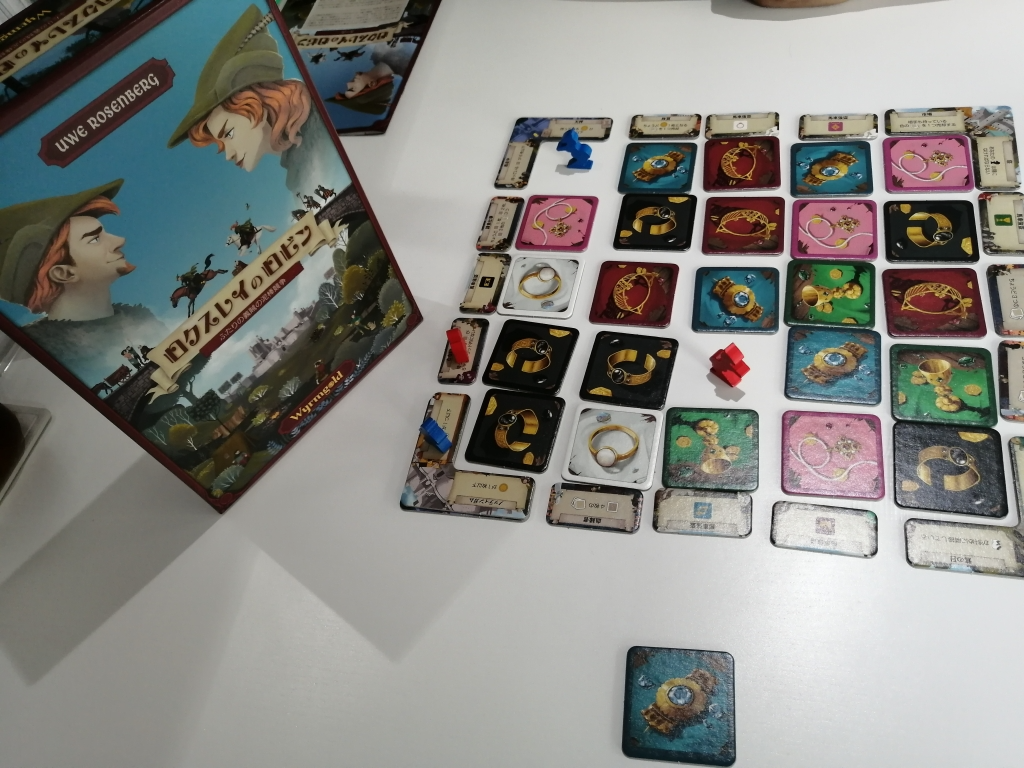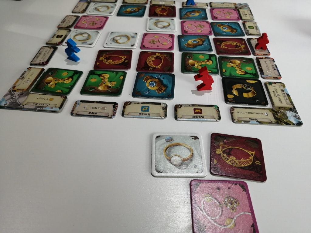 2人用のゲームで、タイルを獲得して条件を満たしていると外周にあるコマが進むことができ、先に2周したプレイヤーの勝ち。