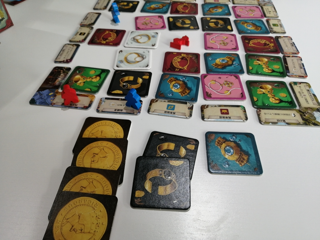 タイルは6種類あり、同じ種類のタイルを3枚以上売却すると売却枚数マイナス2枚を裏向きにして金貨にできます。