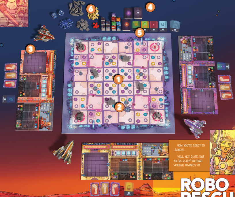 • 1体のロボットフィギュア(プレイヤーボードに一致)、自分に最も近いオープンスペースに置き、隣接するいずれかのスペースの方向に向けて配置します。