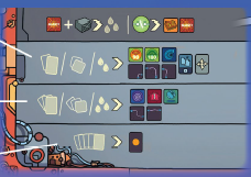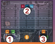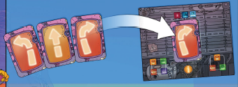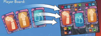コンビ移動 コンビ移動を行うには、1枚のコンビカードと2枚の移動カードをプレイヤーボードのコンビ移動側にプレイします。 コンビカードは中央に、移動カードは両側に配置する必要があります。コンビカードは、1つのコマンドで2枚の移動カードをプログラムできる以外に何の効果もありません。 |