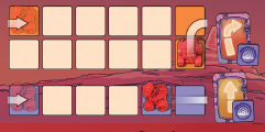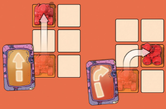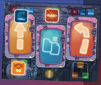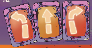 各移動カードは、表示されている2スポットの矢印に従って、ロボットを2スペース移動します。最初の移動は常にロボットが現在向いている方向で、2番目の移動はロボットを再び直進させるか、回転して左右に移動します。