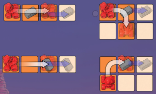 注: ロボットの現在の方向によって、ロボットの移動経路が決まります。壁(ボードの端)またはオブジェクト(ボックスやロボット)がこの経路をブロックする可能性があり、その場合はロボットの移動がブロックされます。現在解決中のカードの残りの移動は無視されます。