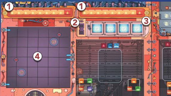 2) コンテナボックスを明るい色の「+」スペースに置き、パワートークンを図のようにボード上の対応するアイコンの上に「オフ」面を上に向けて配置します。