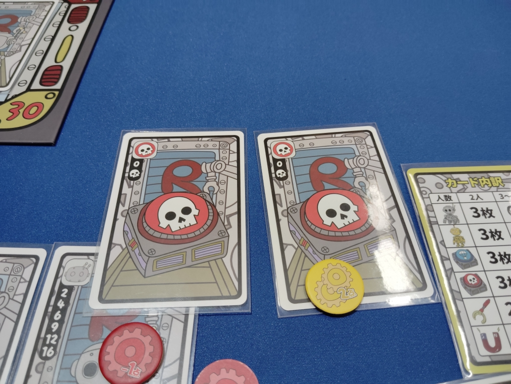 ゲームの流れとしては、手番になったら山札からカードを1枚引いて手札にある2枚のカードから1枚を選び裏向きにして、その上にチップを1枚置きます。