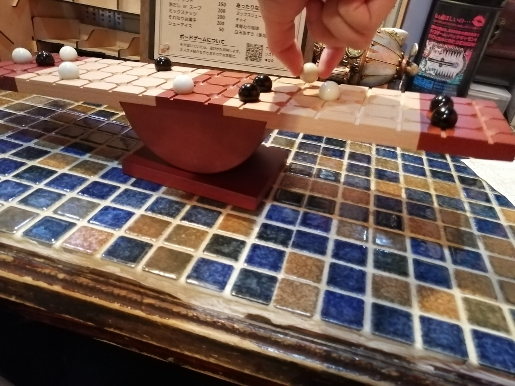 玉を動かすことで板がグラついたりして、自分の手番中に板がテーブルについたら負けになります。