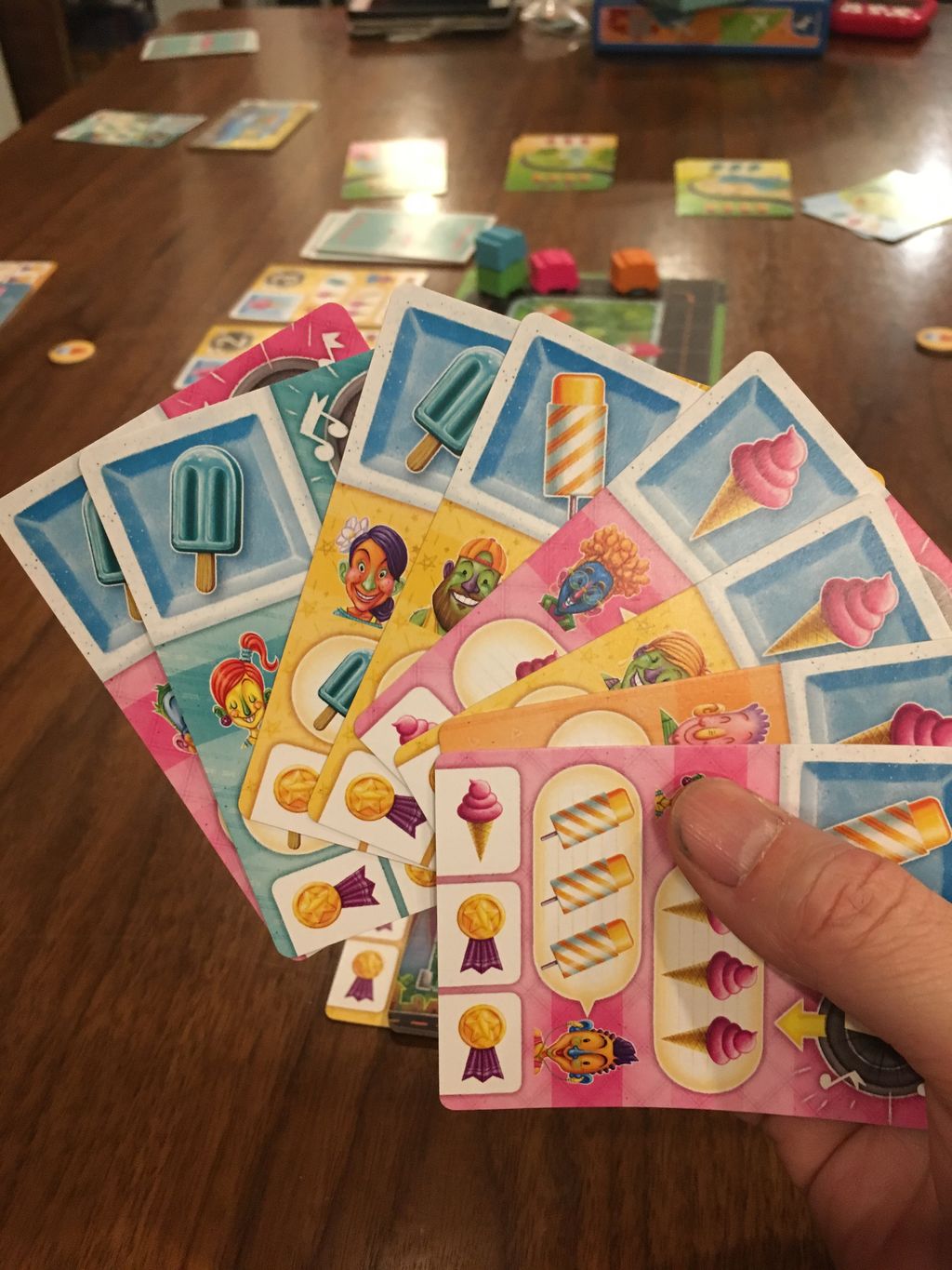 9点という短期決戦のなか、手札をとった枚数だけ、手番がなくなるということで、手番を優先するか、手札を優先するかの選択がある。