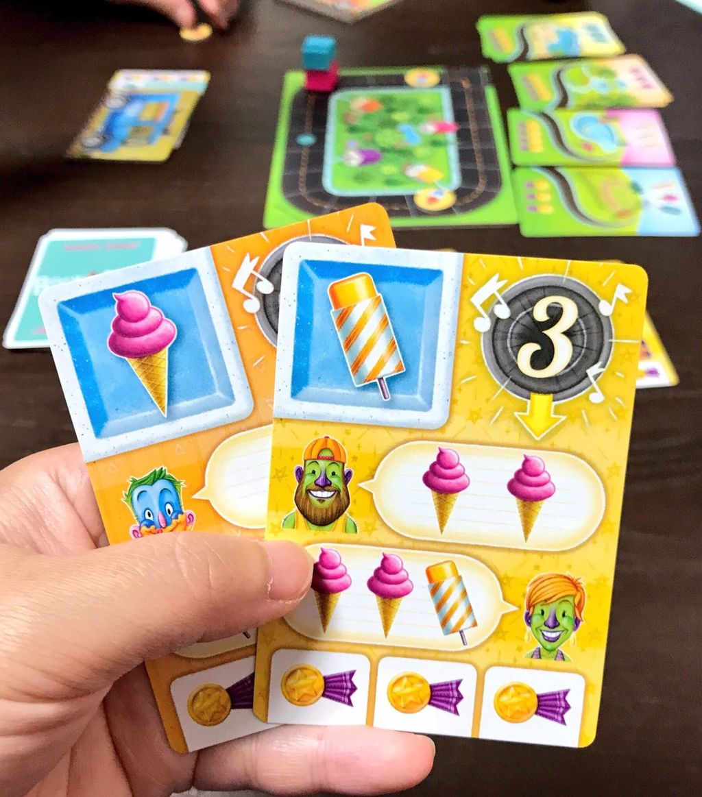 ほぼ宝石のきらめきなんですが、お客さんを2人さばいてカードを達成すると、勝利点と永久的に使えるアイスとが手に入ります。永久的に使えるアイスがある程度集まると、貴族のように手番を消費せずに勝利点がやってきます。が、宝石のきらめきよりも短い分、永久的に使えるアイスが活躍する機会が少なく、ちょっと弱いように思いました。宝石のきらめきは15点で終わりですが、このゲームは9点で終わりです。