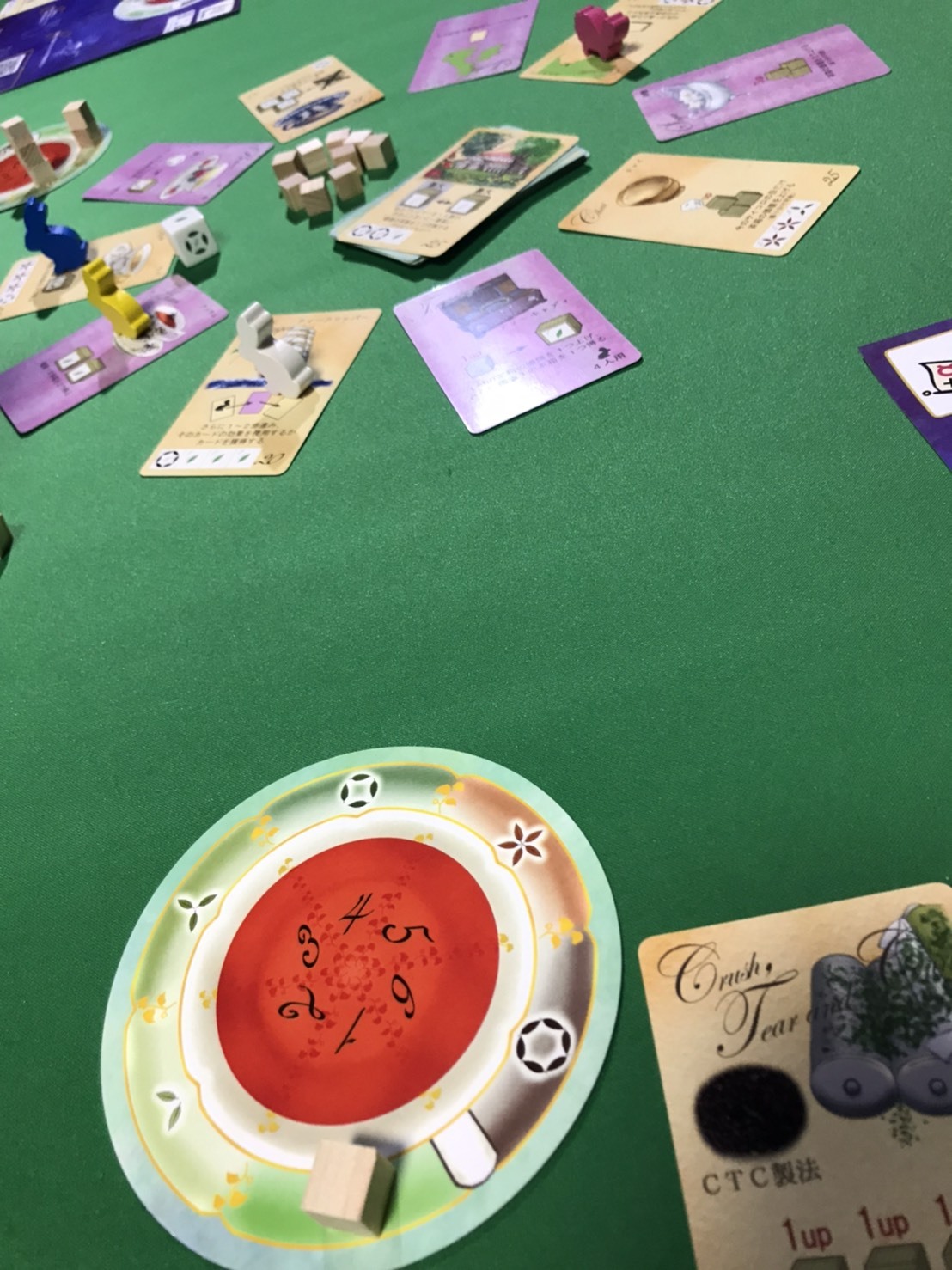ゲームは、中央の山札からめくられその周囲に置かれた10枚のカードの上を時計回りに回ってプレイします。駒は1~3歩ずつ移動しますが、同じマスには基本的に止まれません。他のプレイヤーがいる場合は跳び越してその先まで移動します。そして移動した先のカードの指示に従って茶葉を購入するか、加工して茶葉をランクアップさせます。