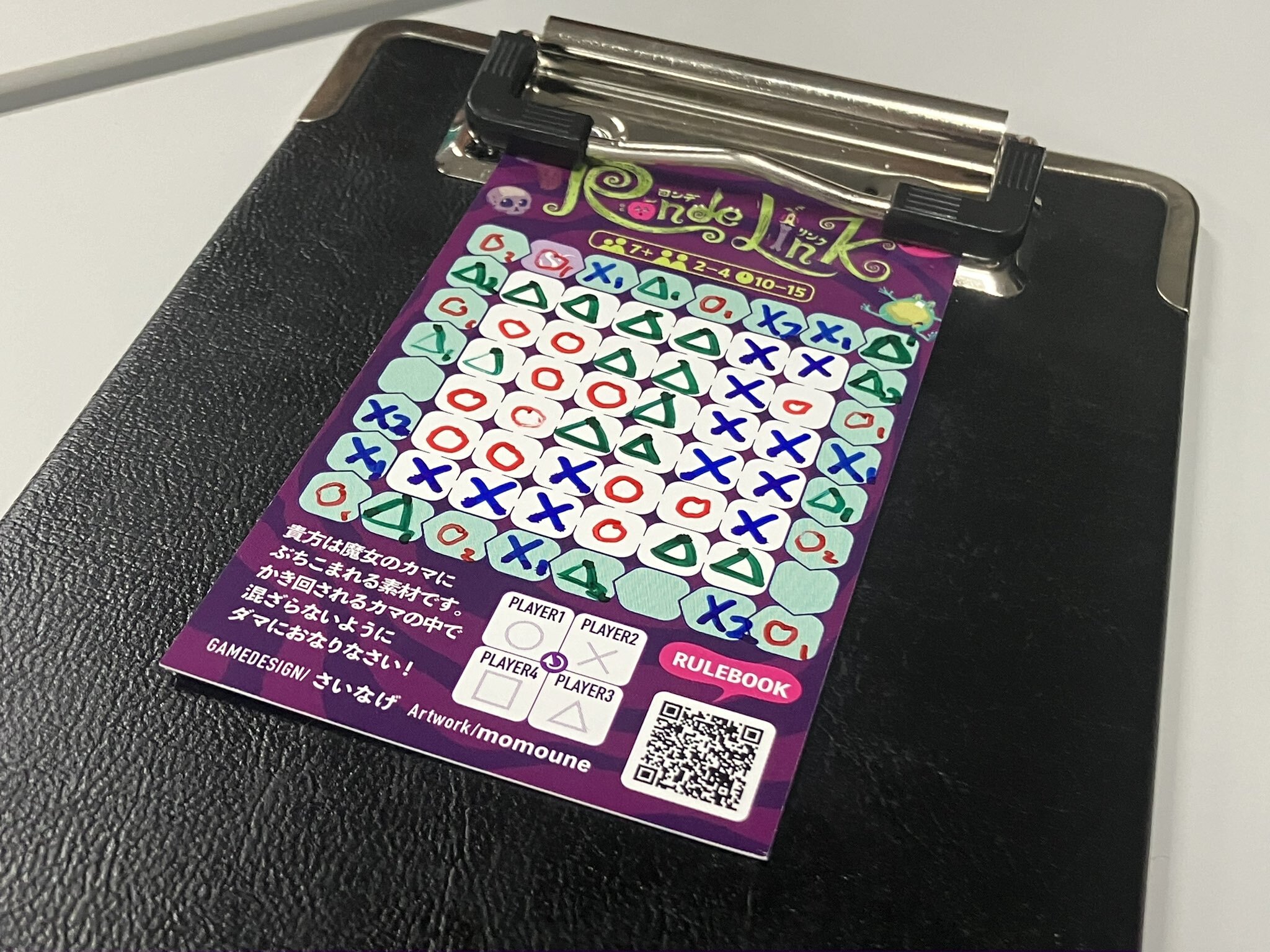 外周を回り、手番で止まった行or列に自分の記号を書くロンデル。自分の記号がひとかたまりになると勝利に近づきます。