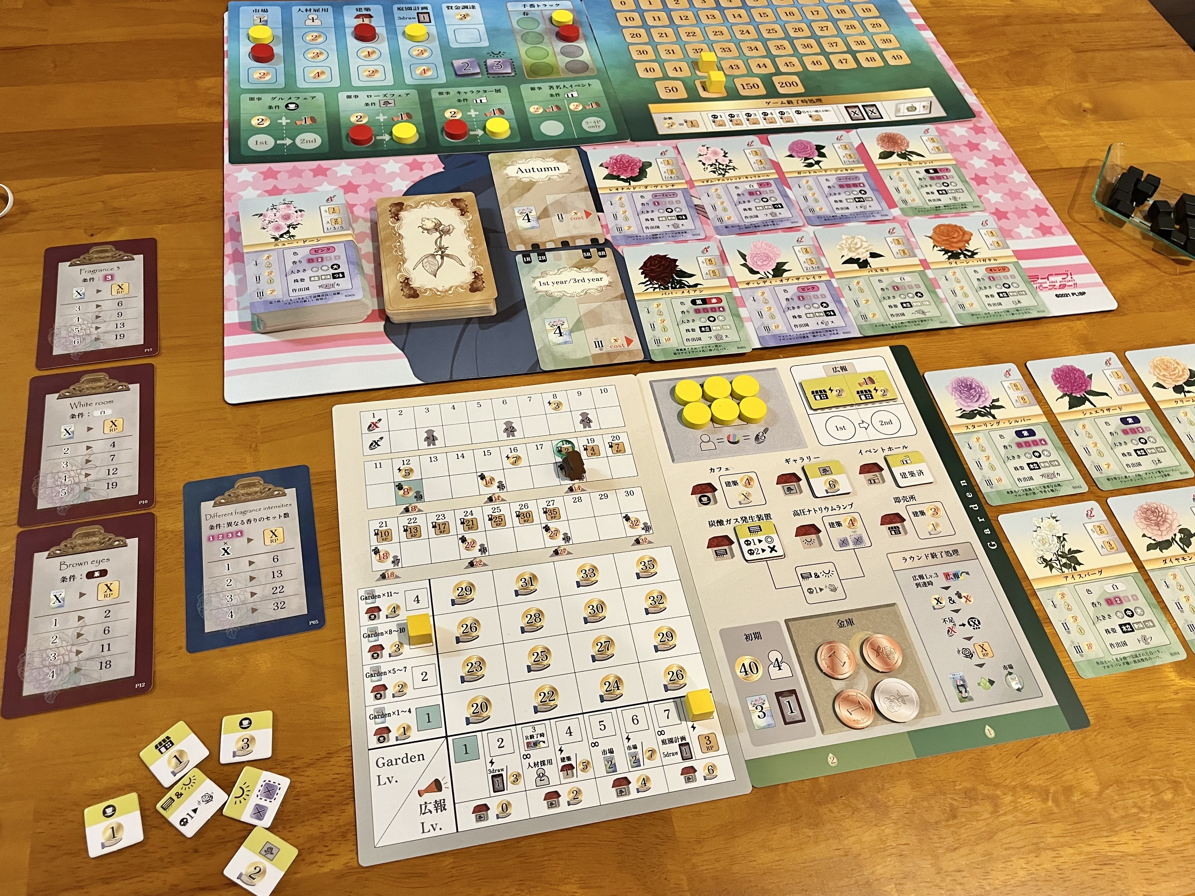 「バラが増えるとより多くのアクションしないワーカーが必要になる」という独特の仕組みにより、ワーカーは増えているのにアクション数が増えない、というオモシロ苦しい状態が発生します。プレイヤーは1アクションを増やすために高コストの強いバラを諦めたり、ギリギリの資金をやりくりして新たな従業員を雇うわけです。もちろん収入のためにカフェや即売所を建設しなければならない。かなりリアルに経営者の苦悩を味わえると思います。
