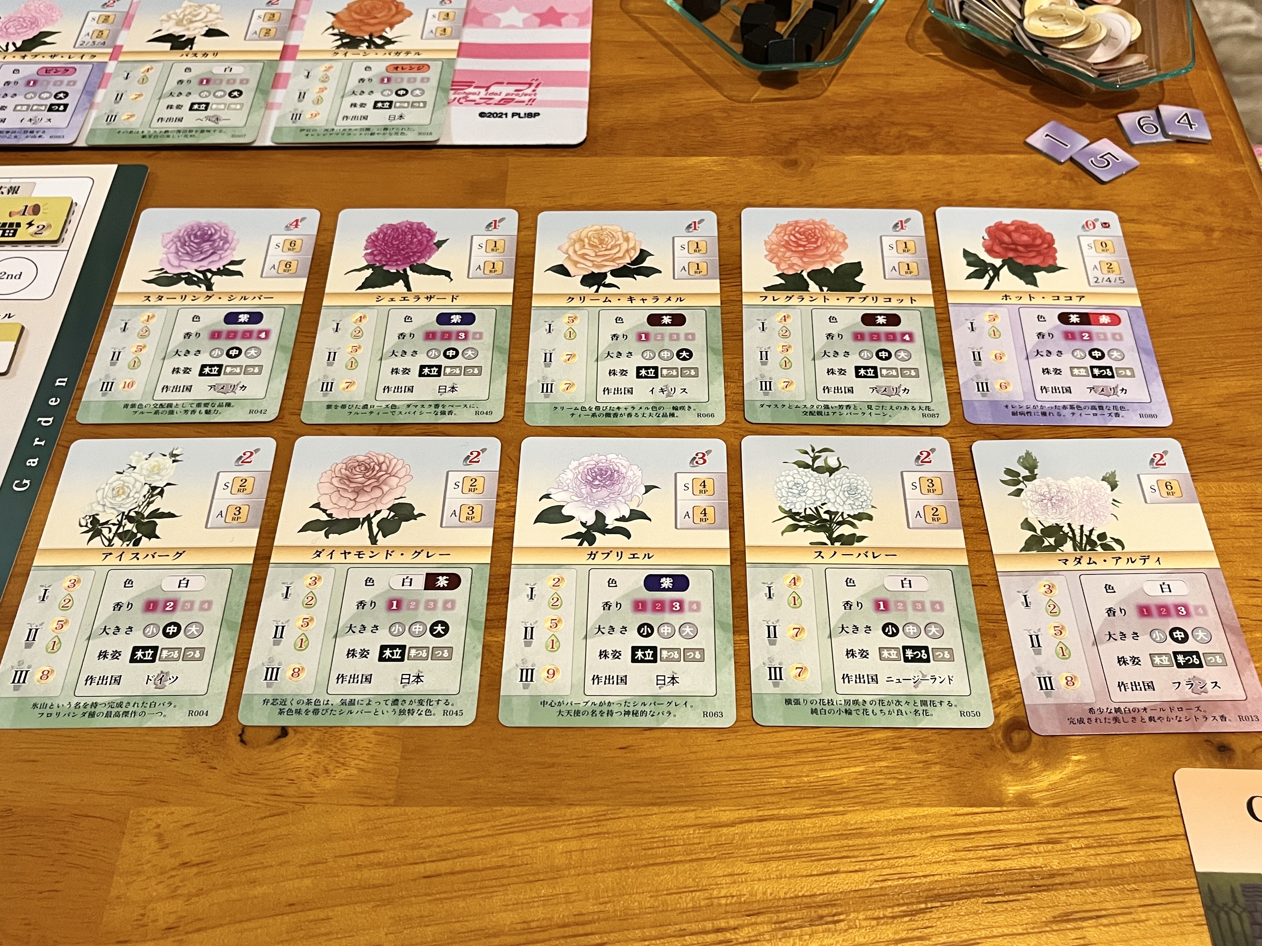 バラは三段階の成長過程を持っていて、1〜2ラウンドかけて咲く(定期的な勝利点になる)買い方と、即座にガーデンに咲かせられる買い方があります。