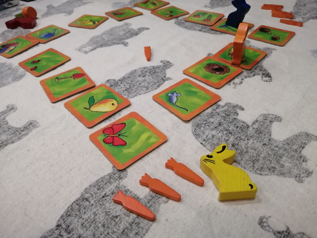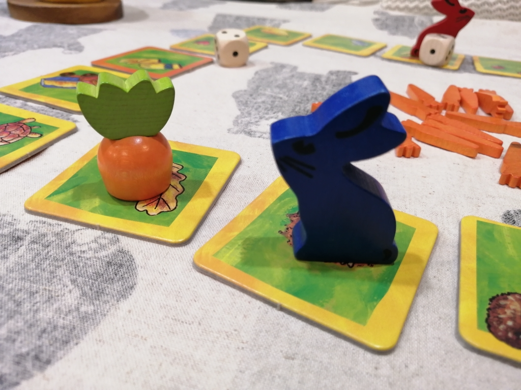 にんじん目指してウサギが走り回り、にんじんにたどり着いたらタイルを裏返して、裏返したアイコンと同じ場所に、にんじんが移動するのでまた追い掛ける。一二三ダイスを2個振り、足しても良くて他のウサギに追いついたらもう一振りできる。可愛らしいダイスゲーム。