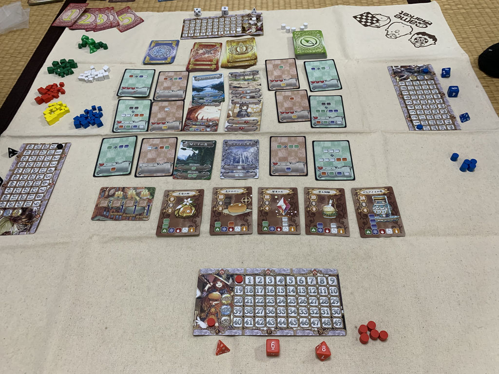 3種のダイス(使い魔)をエリアに出して、資材を集めて、集めた資材で賢者の石などの課題を錬金して勝利点を得るゲーム。
