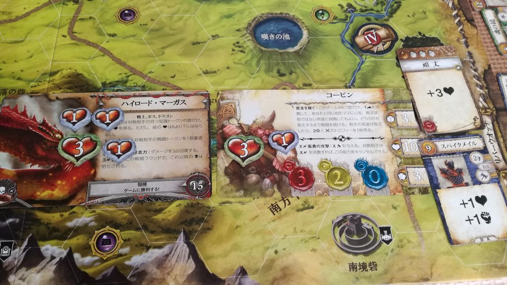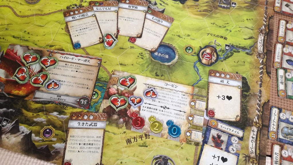 戦闘はだいたいこんな感じです。今回はソロなので敵(モンスター)側も一人でキャストして攻撃を組み立てます。この辺りは、未訳の拡張『アンブレイカブル・バンズ』があれば、もう少しスムーズだったかもしれません。