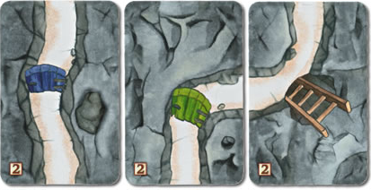 また、はしごカードという新カードの登場により、落石カードの重要性が薄まりました。「お邪魔者1」ではこの落石カードの有無がゲームの勝敗をわけるカギとなっていましたが、「お邪魔者2」ではむしろ大量に出たクリスタルカードを破壊したり、青(緑)の扉カードを破壊したりという事に用いられる事が多くなりました。