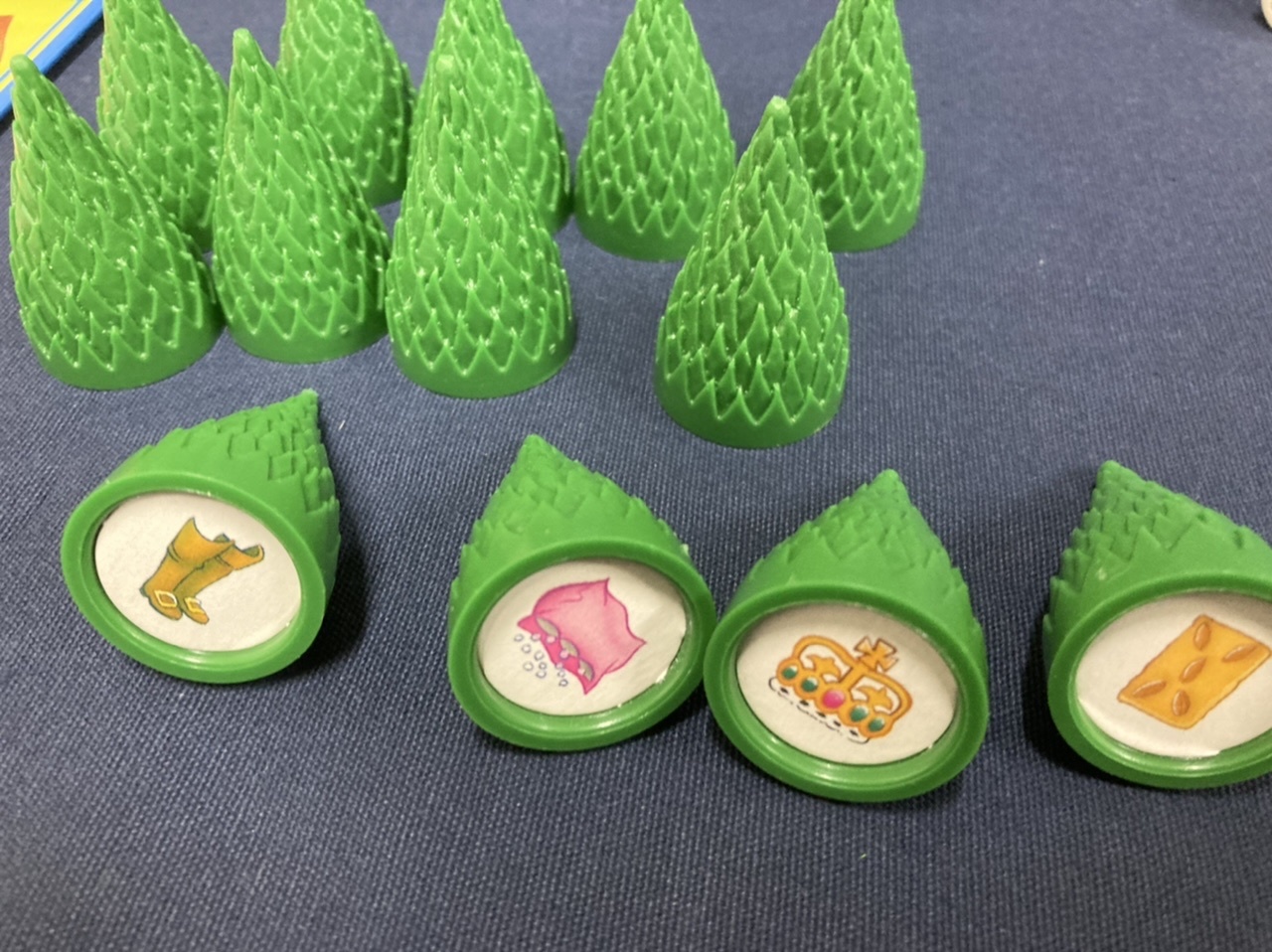 森の中の特定のマスには、プラスチックの木が置いてあり、持ち上げて下を見ると、『ガラスの靴』などのアイテムが一つ描かれて、そのマスにちょうど止まることができたら、こっそりその木の下を見て、アイテムを確認できます。