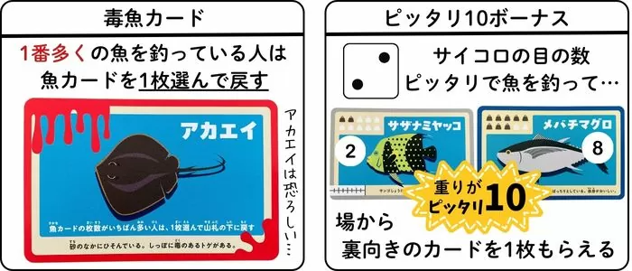 「毒魚カード」やおもりの数がピッタリ10になった場合の「特別ボーナス」がゲームを盛り上げます!