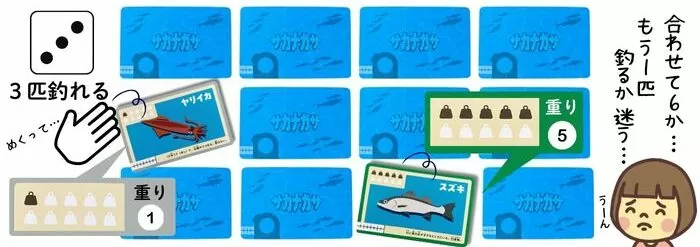 サイコロを振って出た目の数だけ魚を釣ります。カードに書かれているおもりが10を超えてしまうと釣った魚が逃げてしまうので、重さを気にしつつ、大きな魚を狙いましょう!