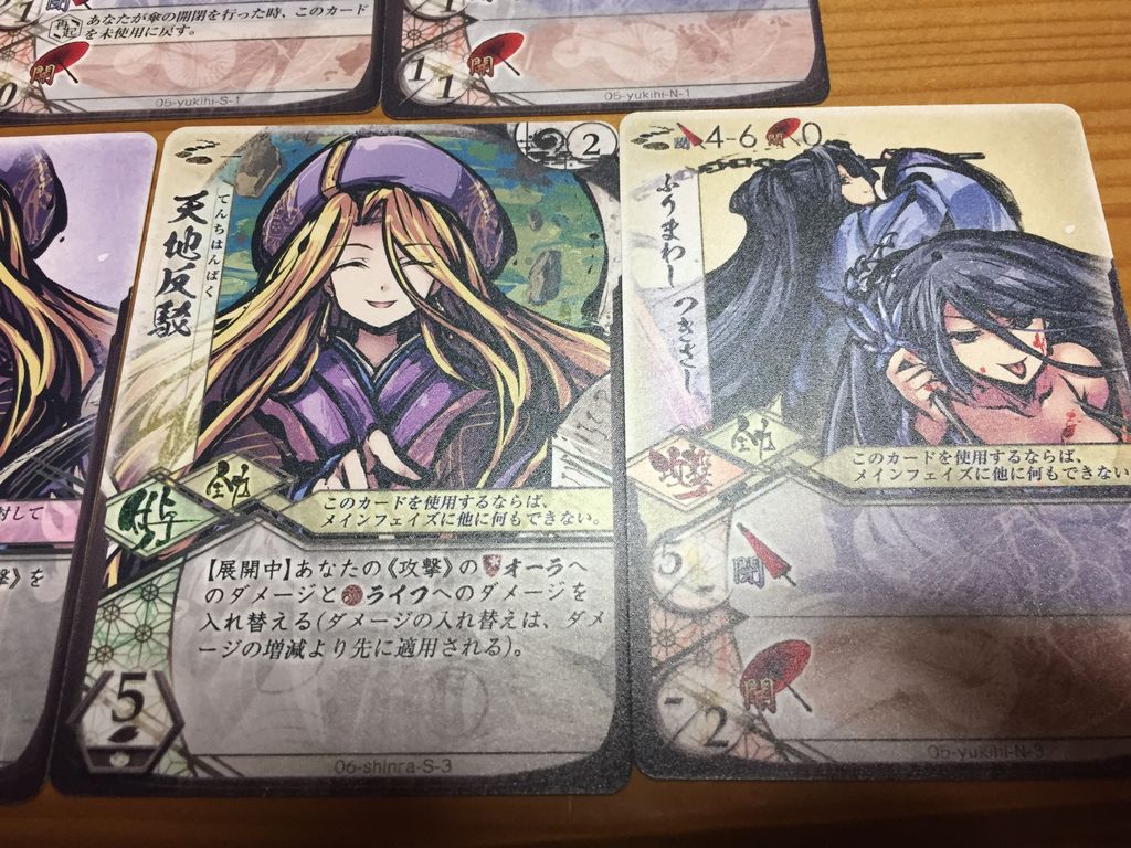 カードをみていくと、シンラの「天地反駁(場に出てる間、自分のオーラ攻撃とライフ攻撃の数字を入れ替える)」出しながらユキヒの「ふりまわし(オーラ攻撃5)をぶっ放すというロマンを追わない手はないと確信。