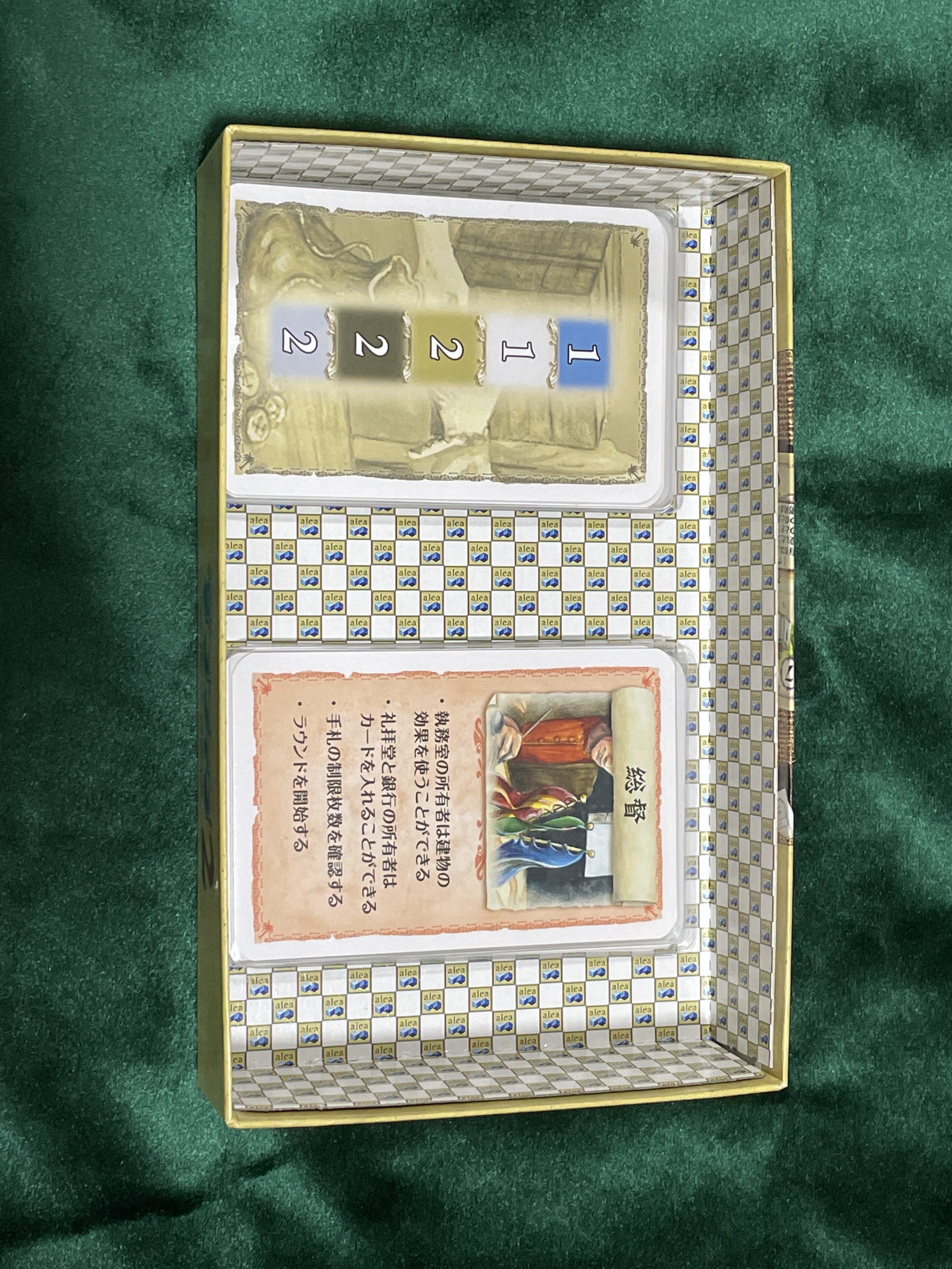 1.総督カード、役割カード、商館カード、初期手札のインディゴ染料工場、大聖堂を同じくらいの枚数で2列で箱に入れる。