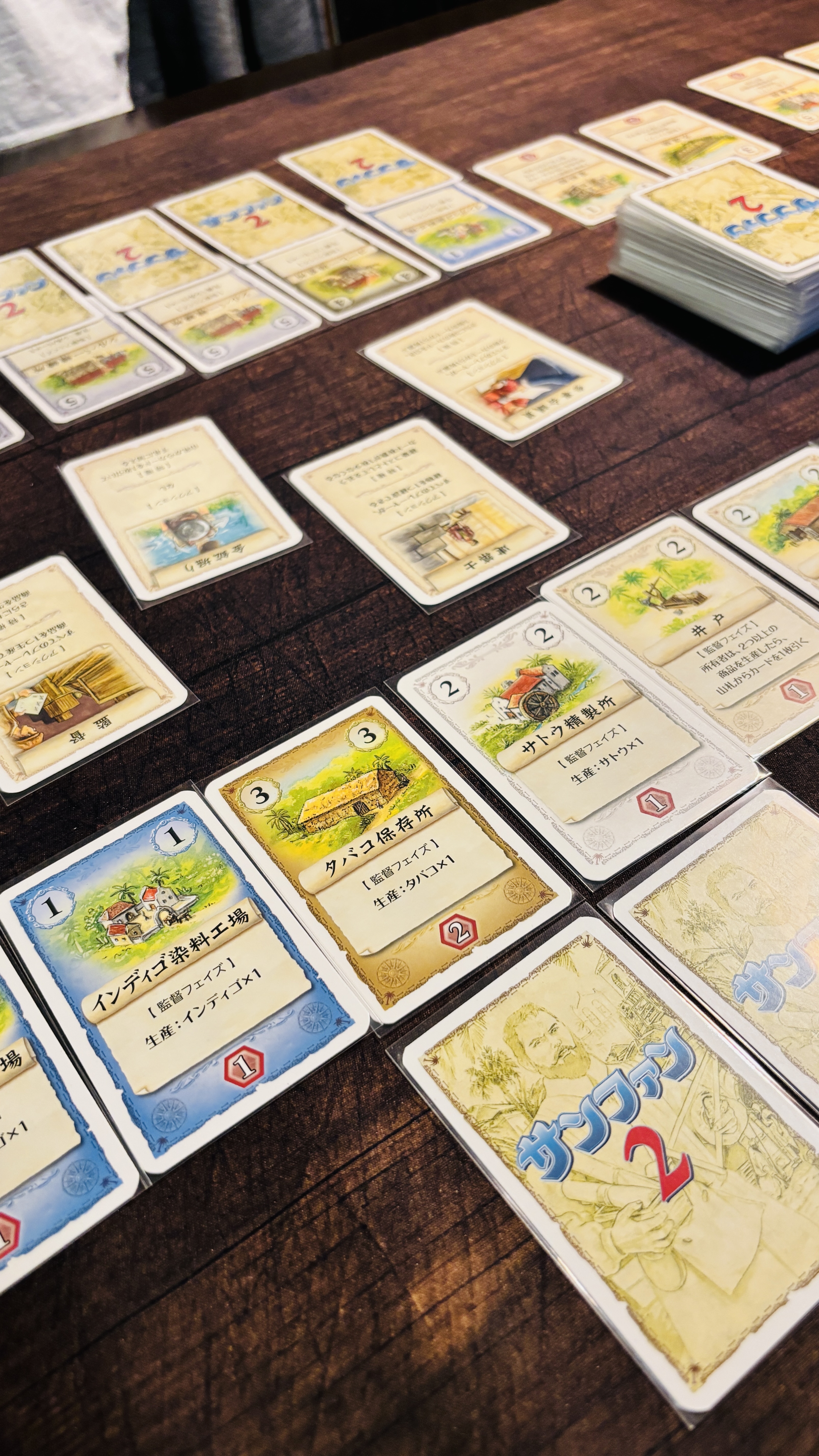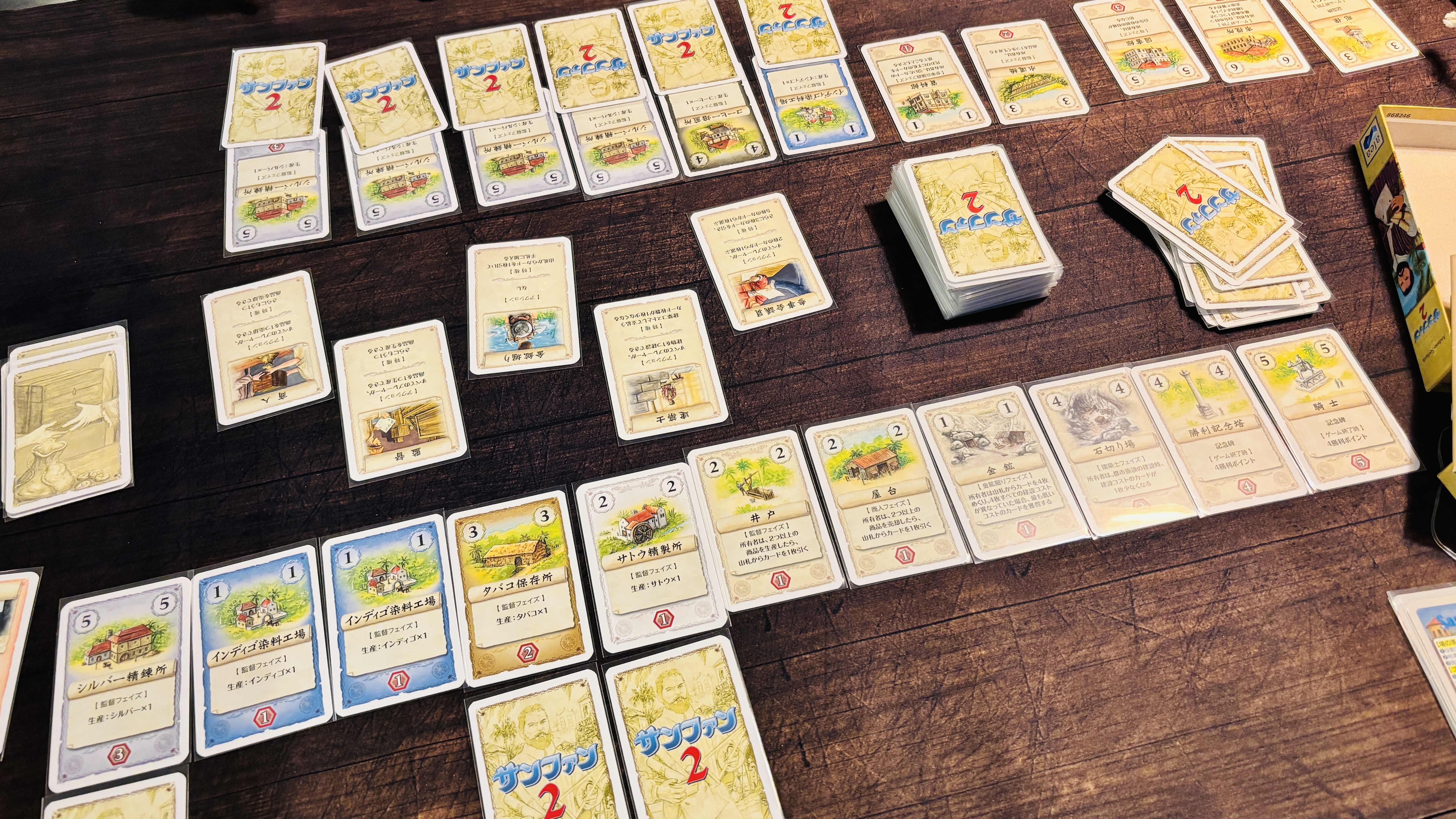 インディゴ染料工場1件から始まり、生産→売却→工場・都市建設を繰り返しながら、徐々に裕福になっていく感じがとても心地よいペースで進んでいき、後半は都市施設の効果にも目が届くようになり、楽しい!と思った頃にゲーム終了。