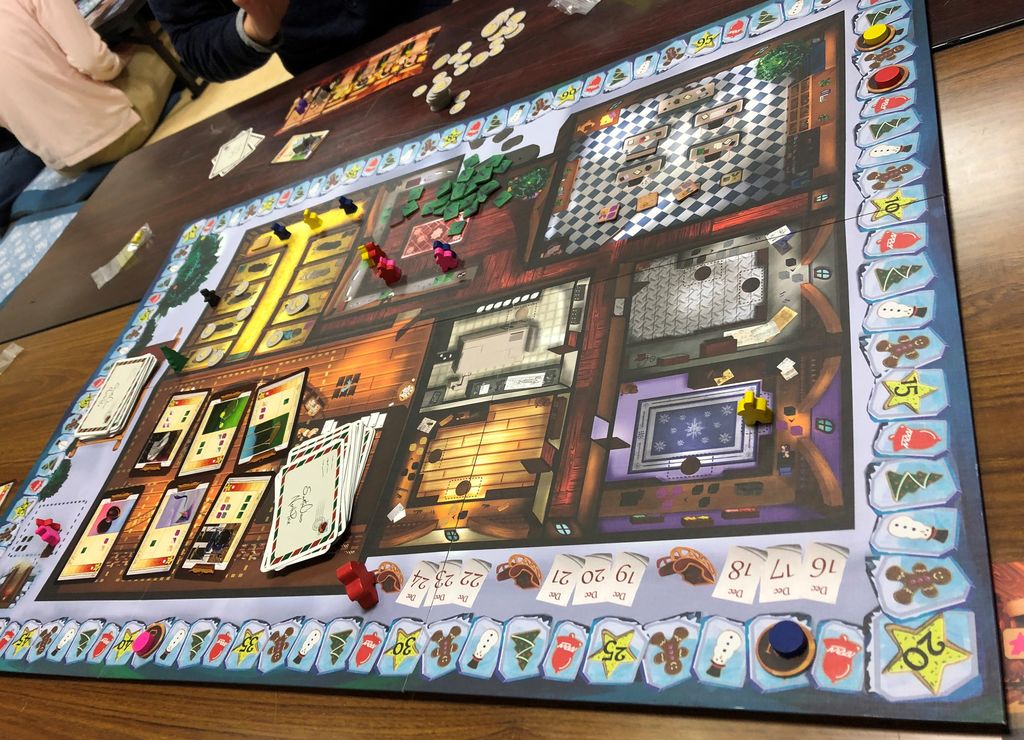 ボード、めちゃくちゃ大きいのですが、せっかくクリスマスがモチーフのゲームなので、アートワークも楽しめてよいなと思います。(最初プレゼントカードを置く前のボードは、なんとなく薄暗くて事件が起きそうでした…)