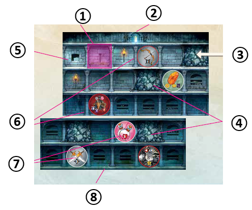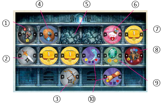 ①スペースは柱で区切られています。各フロアは6つのスペースで構成されています。 ②ダンジョン入口マップは最上部に入口があり、3つのフロアがあります。 ③フロアはダンジョンマップの横1行です。ヒーローフィギュアの隣にあるフロアが現在のフロアです。 ④障害物は、そのスペースにチップをプレイすることを妨げます。鎧、杖、弓などの遠距離効果は障害物を通過できません。 ⑤空きスペースには特徴物や障害物がなく、チップをプレイできます。松明や骨などの風味豊かなイラストが描かれているものもあります。クールですが、ゲームプレイ上の効果はありません。 ⑥ダンジョンの特徴物はチップのような見た目で、チップが配置された場合と同様に効果を発揮します。ヒーローが到達したフロアの特徴物のみが有効になります。 ⑦必須特徴物の周囲には赤い円が描かれています。このスペースにはチップをプレイできません。 ⑧オプション特徴物の周囲には白い円が描かれています。このスペースにはチップをプレイでき、効果はプレイされたチップに置き換えられます。 ⑧ダンジョン深層マップはフロアが2つで、入口はありません。 |