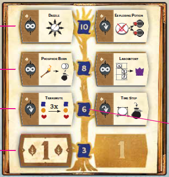 アクティブスキルはラウンドごとに1回使用できます。チップの効果を変更するアクティブスキルの場合は、使用するときにスキルトークンをそのチップの上に配置します。それ以外の場合は、スキルトークンを裏向きにして、ラウンドの残りの間利用できなくなったことを示します。 |