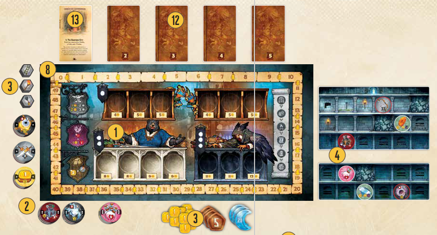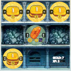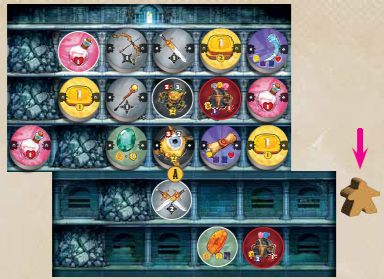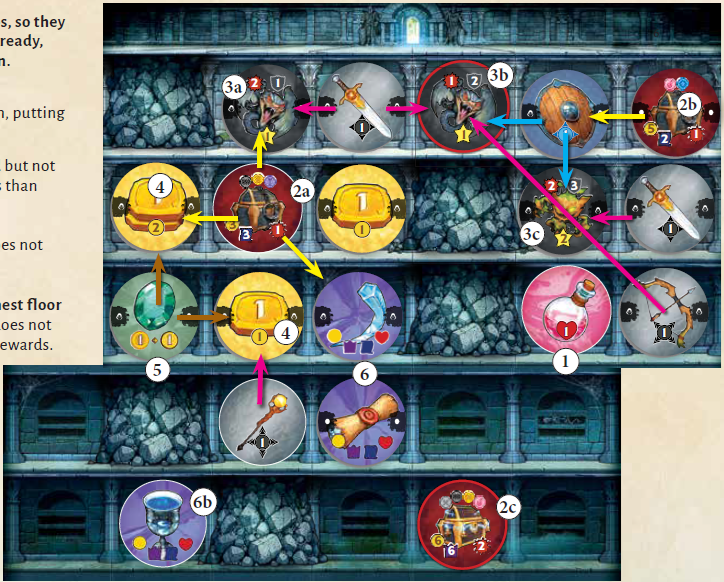 プレイヤーは同時に、バッグからチップを1枚ずつ引いてダンジョンマップに配置します。プレイヤーは一番上のフロアから始め、すべて埋まったら次のフロアに降ります。プレイヤーがダンジョンマップのすべてのフロアを埋めると、ダンジョン深層マップを追加してさらに深く進みます。