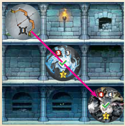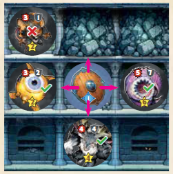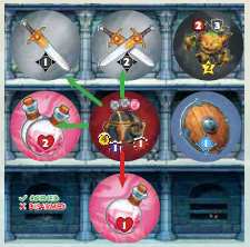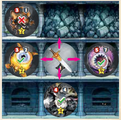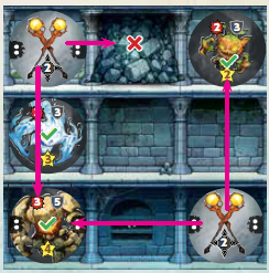 ⚫ 停止:ヒーローフィギュアを現在のフロアに残し、チップを引くことを止めます。これでこのダンジョンは終了しました。通常、すべてのチップをプレイするのが最善であるため、限られた状況おいてのみ早めに停止することをお勧めします。