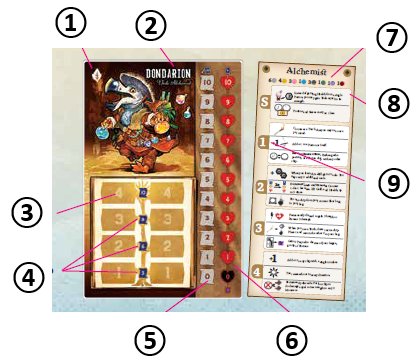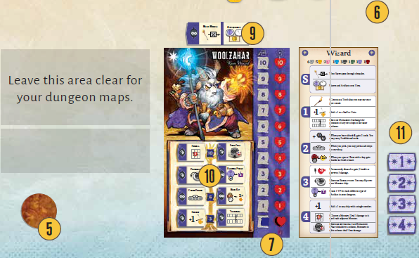 ①ヒーローシンボル ②名前 ③スキルトークンスペース ④レベルアップのXPコスト ⑤経験値(XP)トラック ⑥体力トラック ⑦開始時のチップ数 ⑧開始スキルの詳細 ⑨レベル1スキルの詳細 |