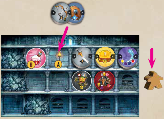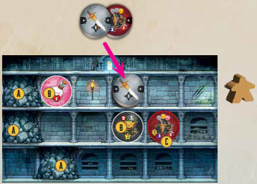 ニックスは引き続け、第1フロアにチップを配置しています。4枚目のチップを引くと、空きスペース(A)に置いてフロアを完成させるか、ポーションのオプション特徴物(B)に置くかの選択する必要があります。ニックスはそれを空きスペースに置き、フロアを完成させます。 今、ニックスは別の選択を迫られています:次のフロアに進むか、立ち止まってダンジョンを離れるかです。彼は続けることを選択したので、ただちにヒーローフィギュアを進めて引き続けます。 |