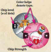 - 背景の色はタイプごとに異なります。 - チップのティアはドットの数で示されています - チップの強さは数字で示されています |